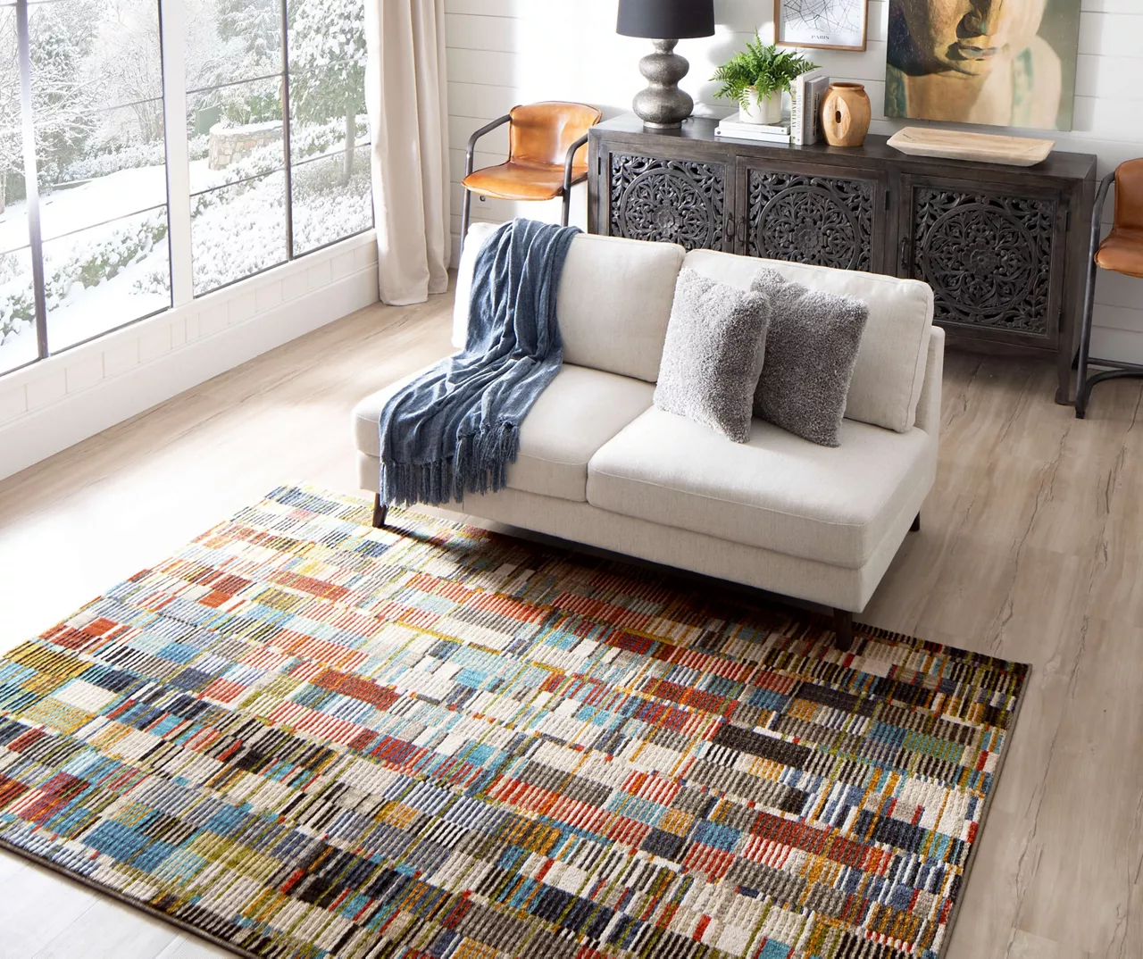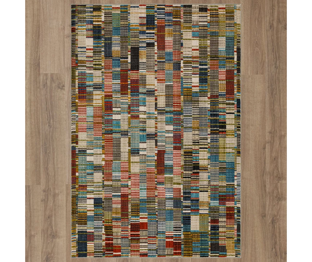 Digitized lines cast in a multi-color palette enliven the contemporary canvas of Mohawk’s Iola area rug. The rich color wheel features a modern mélange of vibrant shades, including heavier hues of gunmetal gray, onyx black, deep admiral blue, golden mustard, celery green, aqua lagoon and ginger spice, beautifully balanced with neutral tints of oyster, oat and dark taupe. Designed with Mohawk’s exclusive EverStrand™ recycled polyester yarn, the styles of the Metropolitan Collection offer a sumptuous softness, superior stain resistance and dependable durability.