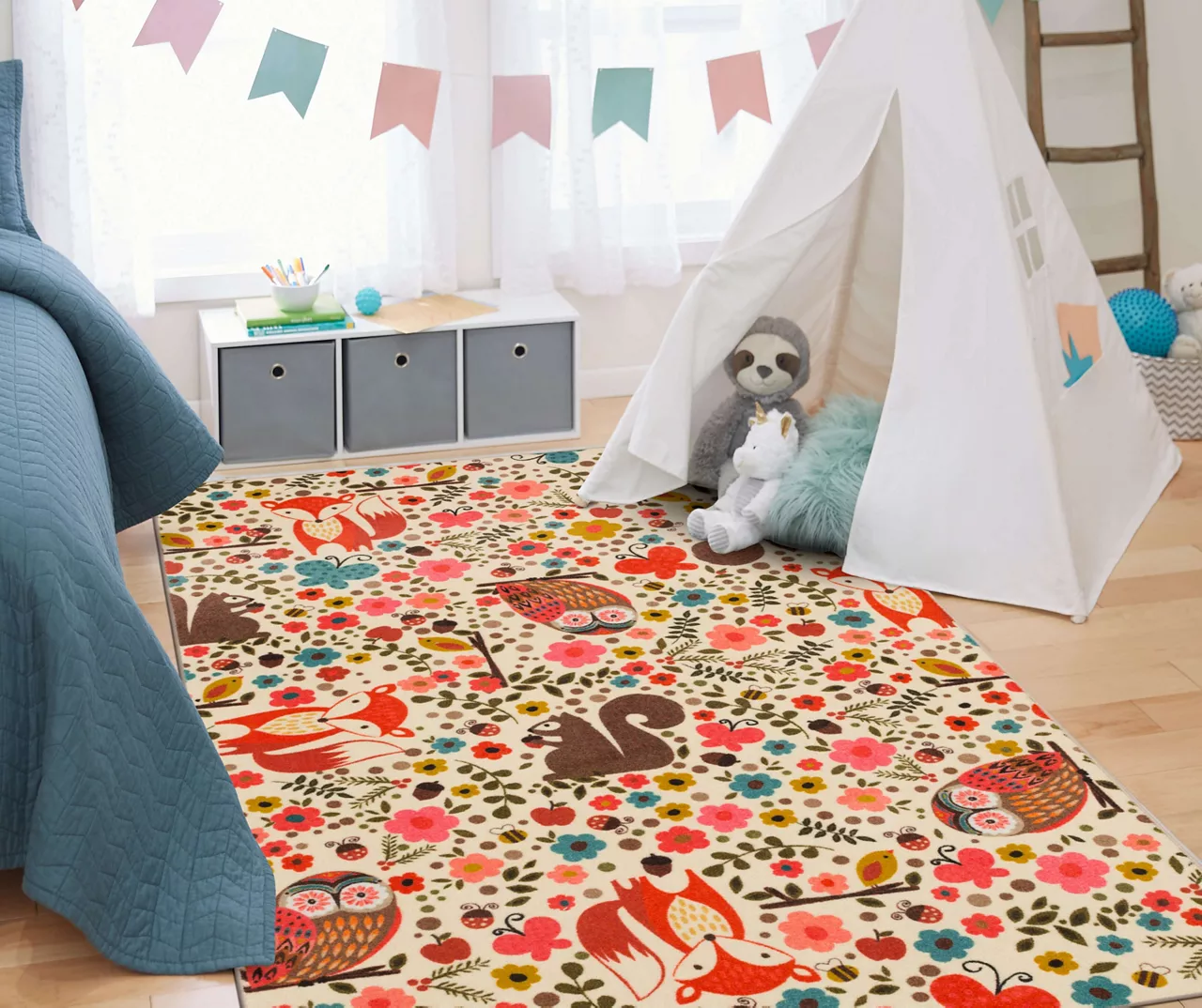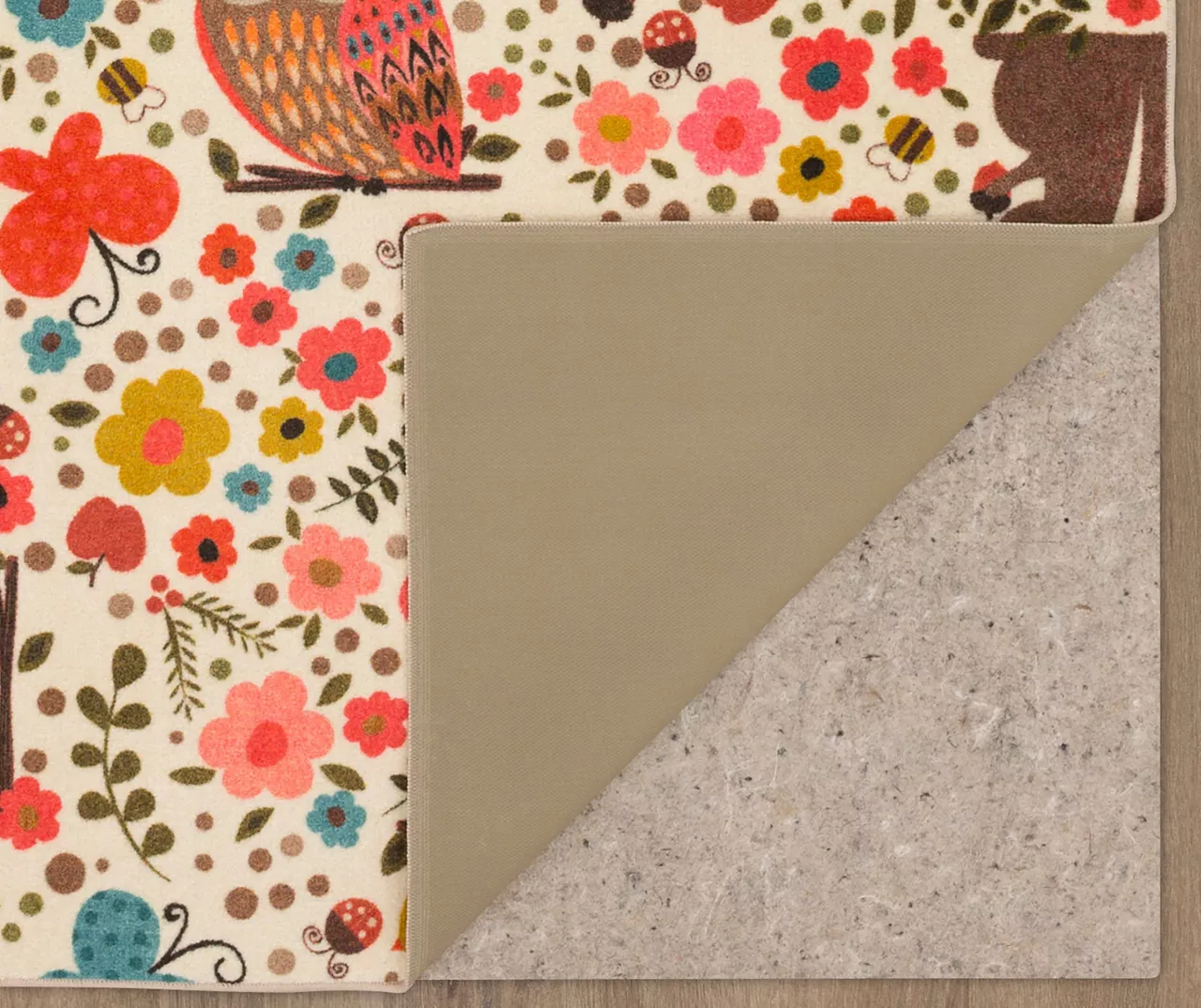 Friendly foxes, owls, squirrels, ladybugs, butterflies, birds and bumble bees play alongside fresh florals in the whimsical multi-color design of Mohawk Home’s Enchanted Forest area rug. This area rug is ideal for kids spaces, bedrooms, nurseries, playrooms, classrooms and more. Thoughtfully crafted in the U.S.A., this rug is designed on a plush EverStrand™ tufted base made from premium recycled polyester. A non-skid latex backing helps to keep things in place, and the low pile is durably designed to easily work with doorways or furniture while withstanding everyday use.