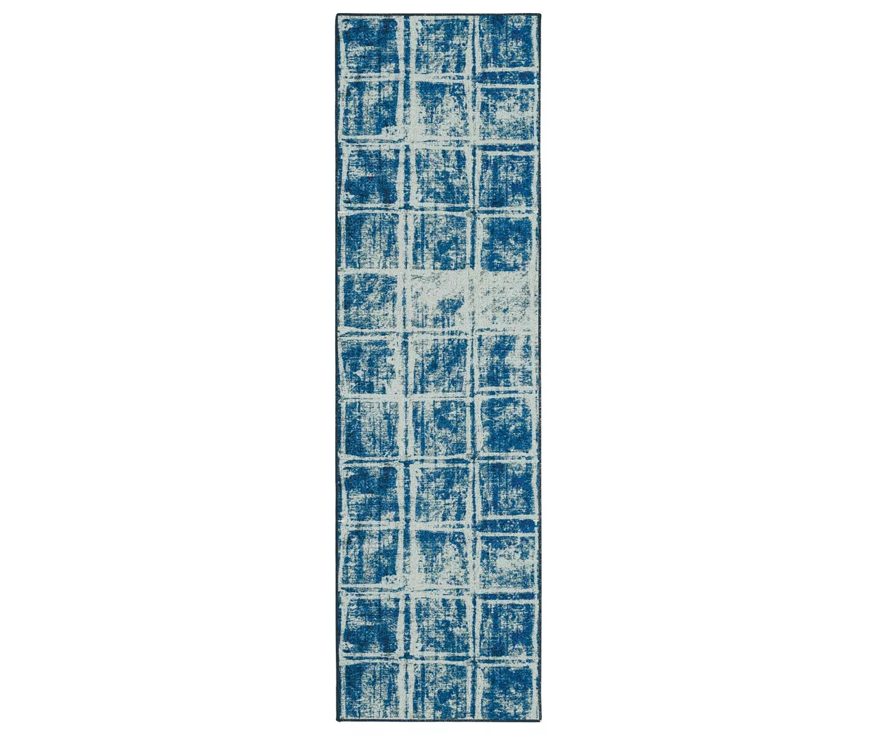 Rows of modern squares inspired by hand-drawn artistry are stamped in soft neutral shades across the distressed blue-colored background of this area rug from Mohawk. Subtle distressing and color washing techniques add to the originality of this contemporary boho chic beauty. Thoughtfully crafted in the U.S.A. utilizing Mohawk Home’s exclusive precision dye-injected printer, this rug is designed on a plush EverStrandâ„¢ tufted base made from premium recycled polyester. A non-skid latex backing helps to keep things in place, and the low pile is durably designed to easily work with doorways or furniture while withstanding everyday use.