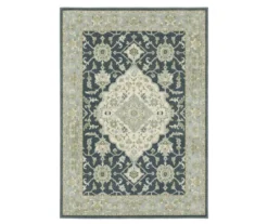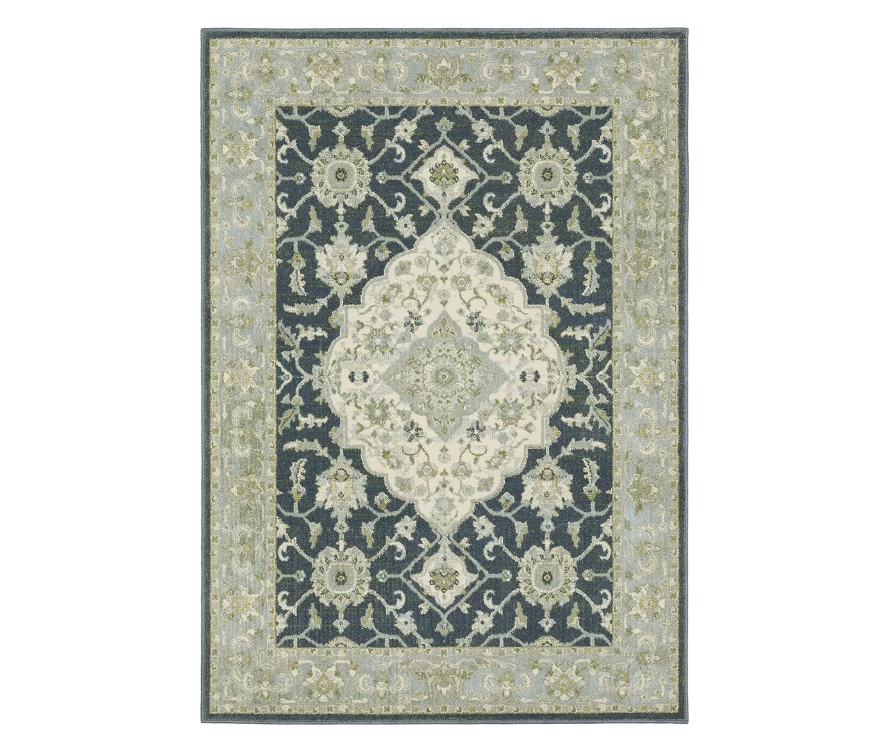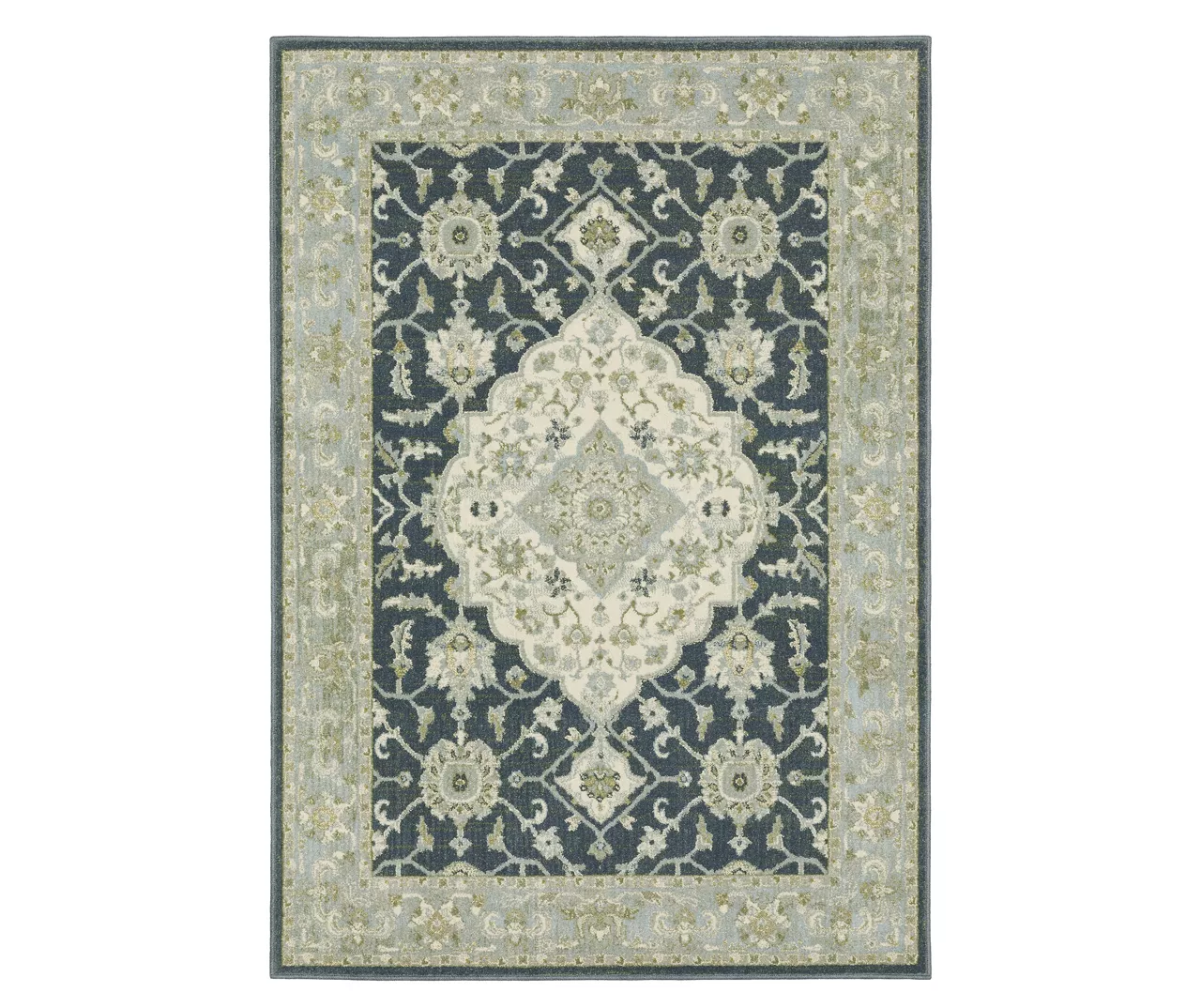 The Thornfield collection is power-loomed in the USA from tri-colored and textured polypropylene yarn. It features a floral medallion design in beautifully updated, yet classic colors of deep navy, cool soft blue, moss green and neutrals. The multi-colored yarns add depth and visual interest to the designs and the textured effect creates a very soft feel underfoot.